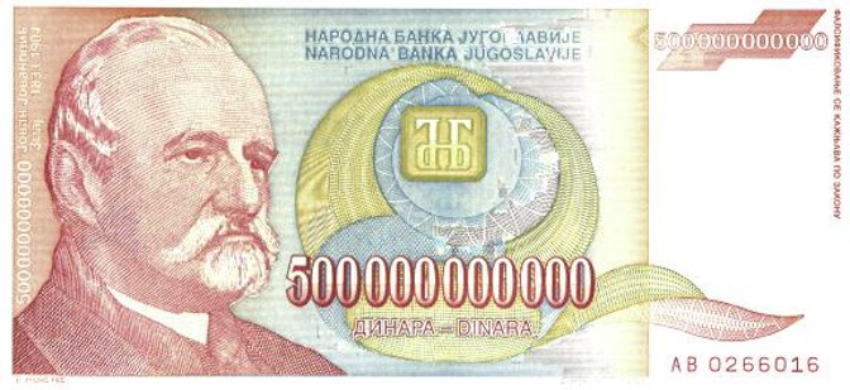 表紙の写真はいずれも外国で実際に起こったハーパーインフレの時のお札で、上が1993年の旧ユーゴスラビアの5000億ディナール札(2~3百円の価値だった由)、下は略号で書いてあるので数字では読めませんが、第2次大戦後のハンガリーのインフレの時の10垓(がい)(10の21乗=10億掛ける1兆)ペンゴ札(すぐに紙屑)です。この様なインフレを起こさない、物価の安定が中央銀行の使命だとされています
