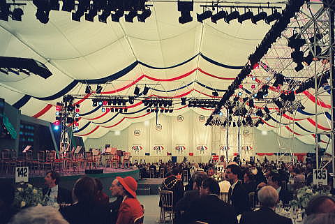 In the tent, 155 tables for 10 seats each were set surrounding the stage in the centre.(below right 2 pictures) Sitting at the table we wait for the start drinking champagne from 10:30