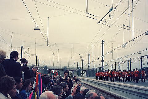 After the luncheon, we moved by coaches to the large temporary stand on the Folkestone platform and waited for the arrival of the Queen and the President in the opposite platform.(2 pictures below)